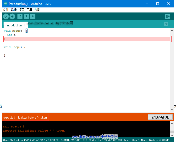 以上圖為例 ,以上的代碼錯誤提示顯示在第3行,但是真正的錯誤是在第2行,在使用arduino IDE中開發,使用的是C語言來進行開發,C語言的一個規則是每一個完整的代碼語句需要用一個引號(;)來代表這一句代碼的結束,在第2行的代碼(int a)在結尾缺少了結束的引號(;),所以導致編譯的出錯。