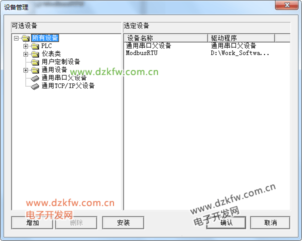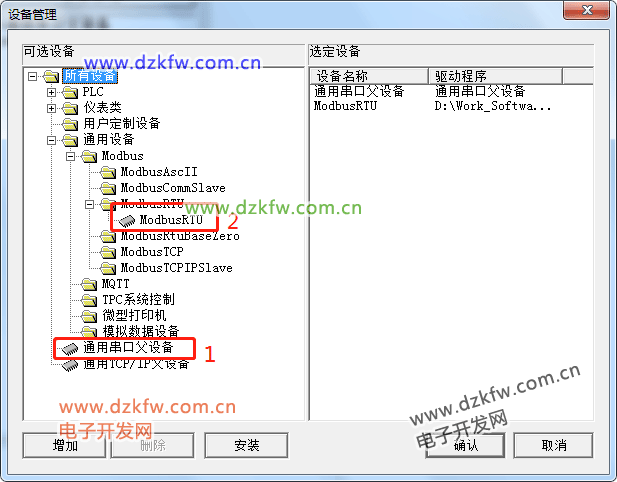 首先點擊通用串口父設備,按確定;再重復步驟,點擊ModbusRTU,就把串口和ModbusRTU都加入到設備工具欄中了。