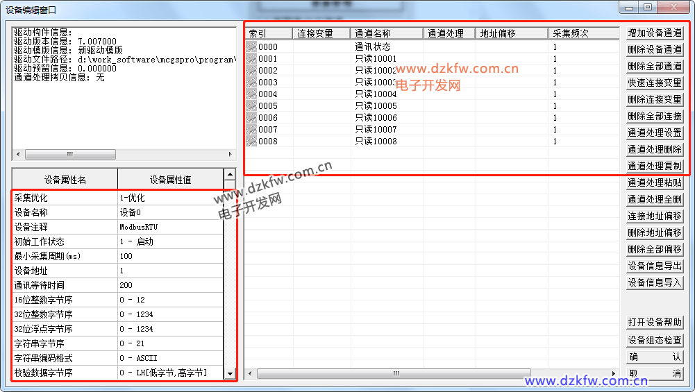 再點擊設備0--[ModbusRTU]這項,就可以看到設置參數了。左下部分可以設置讀取的相關信息,例如奇偶校驗位,采集間隔等等。右上部是設備通道,就是讀取ModbusRTU的寄存器位等信息。