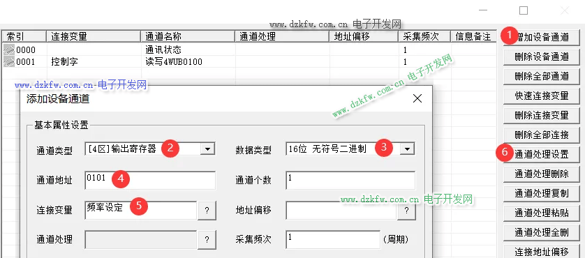 (4)繼續添加頻率設定設備通道地址40101,操作方法如圖8所示。但需要注意的是,頻率0-50HZ對應十進制數0-16384的值,因此需要做數據處理,點擊圖8中的⑥處進行轉換。其他地址操作方法相同,不再贅述。