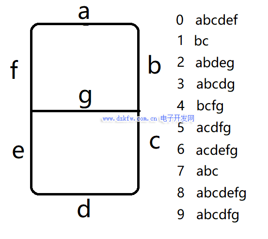 組成這個7段數(shù)碼管的每個部分又分為a,b,c,d,e,f,g部分,分別對應如下所示: