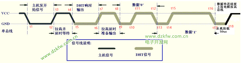 (3)數(shù)據(jù)傳輸階段:數(shù)據(jù)傳輸階段,每一bit數(shù)據(jù)都以50us低電平(t9-t10)時隙開 ,數(shù)據(jù)0和數(shù)據(jù)1的區(qū)別在與高電平的時間長短。