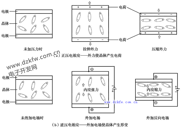 根據圖1-2所示,對石英晶體施加的力方向不同時,其產生的電壓極性也不同;對石英晶體施加電壓的極性不同時,其產生的機械應力(變形)也不同。另外,若施加的力消失,石英晶體就會復原;施加的電壓消失,石英晶體產生的機械應力也隨之消失。