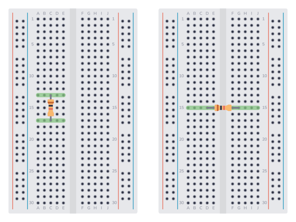 這意味著組件的引腳必須位于不同的行或電路板的不同側面。下面您可以看到連接電阻器的兩種方法: