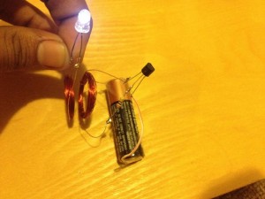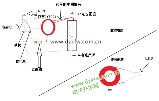 4)連接:將線圈的抽頭端連接到AA電池的正極,將三極管的發射極連接到AA電池的負極。現在你可以把連接LED的線圈慢慢接近抽頭線圈,正常的話LED將點亮。
