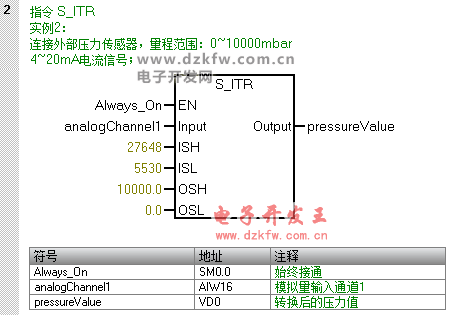 假設模擬量輸入模塊連接的外部壓力傳感器,輸入信號為0~20mA的電流信號,壓力的范圍為0~10000 mbar,輸入通道的地址為:AIW16,轉換后數據存放在VD0中,則代碼如下: