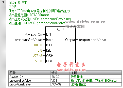假設使用4~20mA的模擬量輸出信號控制比例閥的輸出壓力,其輸出量程范圍為:0~6000mbar,輸出通道的地址為AQW32,輸出壓力設定值存放在VD4,則代碼如下: