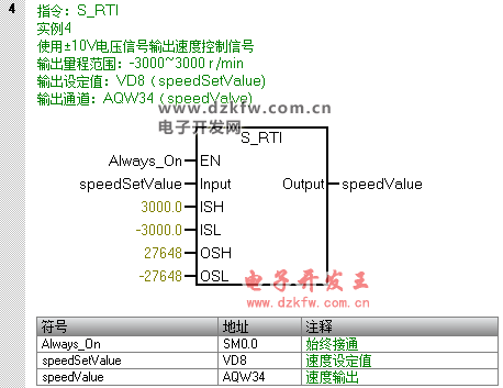 假設輸出±10V的電壓信號用于速度控制,正值表示正轉,負值表示反轉,轉速絕對值的范圍為:0~3000r/min,輸出通道AQW34,輸出設定值VD8,則代碼如下: