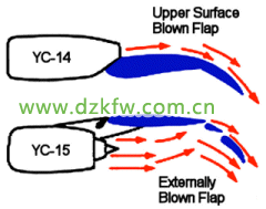 YC-14利用的康達效應,在飛機設計上也叫外吹襟翼增升技術。外吹,既可以往機翼上表面吹,也可以往機翼下表面吹。就像YC-15那樣: