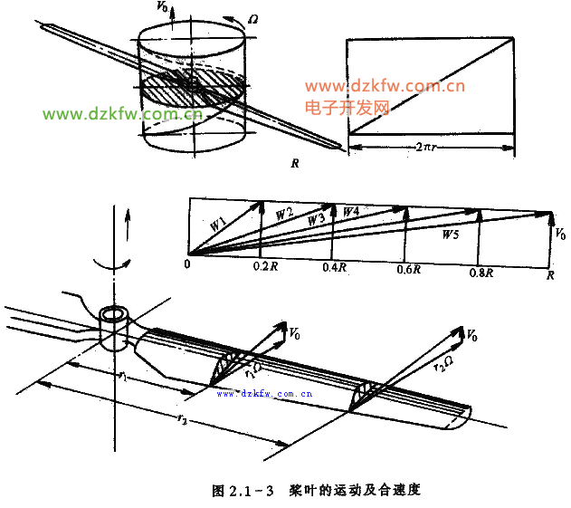 先來考察一下旋翼的軸向直線運動這就是直升機垂直飛行時旋翼工作的情況,它相當于飛機上螺旋槳的情況。由于兩者技術要求不同,旋翼的直徑大且轉速小;螺旋槳的直徑小而轉速大。在分析、設計上就有所區別設一旋冀,槳葉片數為k,以恒定角速度Ω 繞軸旋轉,并以速度 Vo沿旋轉軸作直線運 動。如果在想象中用一中心軸線與旋翼軸重合,而半徑為 r的圓柱面把槳葉裁開(參閱圖 2,1—3),并將這圓柱面展開成平面,就得到槳葉剖面。 既然這時槳葉包括旋轉運動和直線運動,對于葉剖面來說,應有用向速度 (等于Ωr)和垂直于旋轉平面的速度(等于 Vo), 而合速度是兩者的矢量和。顯然可以看出(如圖2.1—3),用不同半徑的圓柱面所截出來的各個槳葉剖面,他們的合速度是不同的: 大小不同,方向也不相同。如果再考慮到由于槳葉 運動所激起的附加氣流速度(誘導速度) ),那么槳葉各個剖面與空氣之間的相對速度就更加 不同。與機翼相比較,這就是槳葉工作 條件復雜,對它的分析比較麻煩的原因所在。