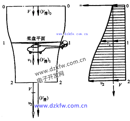 這里的v1是槳盤處的誘導速度。v2是下游遠處的誘導速度,也就是在均勻流場內或靜止空氣中所引起的速度增量。對于這種現象,可以利用牛頓第三用動定律來解釋拉力產生的原因。