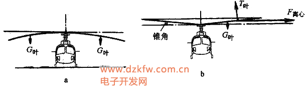 在前面的分析中,我們假定槳葉位:槳轂旋轉平面內旋轉。實際上,目前的直升機都具水平鉸。旋翼不旋轉時,槳葉受垂直 向下的本身重力的作用(如下圖左)。旋翼旋轉 時,每片葉上的作用力除自身重力外, 還有空氣動力和慣性離心力。空氣動力拉力向上的分(T)方向與重力相反,它繞水平鉸構 成的力矩,使槳葉上揮。慣性離心力(F離心)相對 水乎鉸所形成的力矩,力求使槳葉在槳轂 旋轉平面內旋轉(如下圖右)。在懸停或垂直飛 行狀態中,這三個力矩綜合的結果,使得 槳葉保持在與槳轂旋轉平面成某一角度的位置上,翼形成一個倒立的錐體。 槳葉從槳轂 旋轉平面揚起的角度叫錐角。槳葉產生的拉力約為槳 葉本身重量的10一15倍,但槳葉的慣性和離心力更 大(通常約為槳葉拉力的十幾倍),所以錐 角實際上并不大,僅有3度一5度。