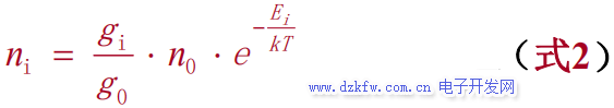 在熱力學平衡時,單位體積的基態原子數n0與激發態原 子數ni的之間的分布遵守玻耳茲曼分布定律: