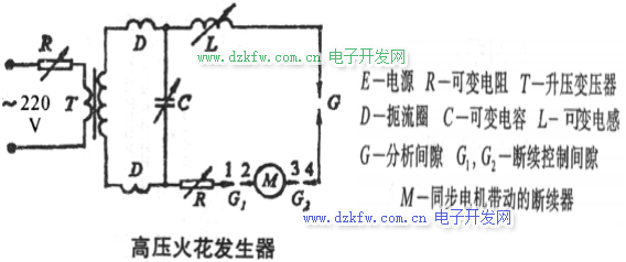 (2)振蕩電壓經B2的次級線圈升壓到10kV,通過電容器C2將電極間隙 G的空氣擊穿,產生高頻振蕩放電。