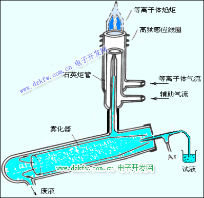 當高頻發生器接通電源后,高頻電流I 通過感應線圈產生交變磁場(綠色)。開始時,管內為Ar氣,不導電,需要用高壓電火花觸發,使氣體電離后,在高頻交流電場的作用下,帶電粒子高速運動, 碰撞,形成“雪崩”式放電,產生等離子體氣流。在垂直于磁場方向將產生感應電流(渦電流,粉色),其電阻很小,電流很大(數百安),產生高溫。又將氣體加熱、 電離,在管口形成穩定的等離子體焰炬( 10,000k )。