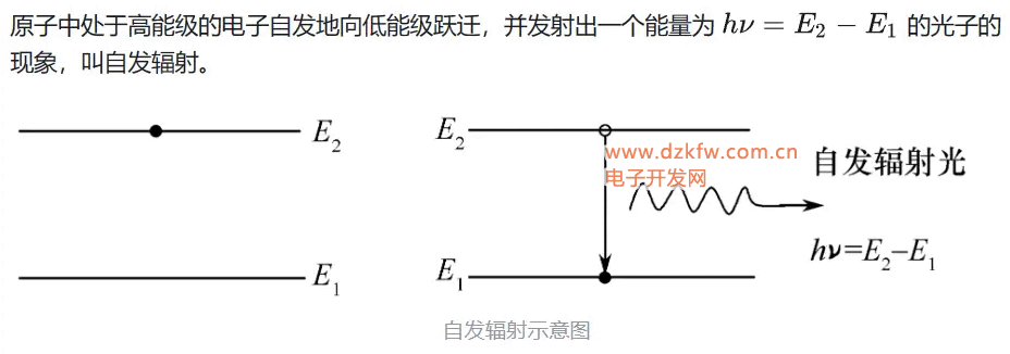 在一個原子體系中,電子基本上是分層運動的,有些原子處于高能級,有些處于低能級;因為原子總會受到外界環境(溫度、電、磁)的影響,高能級電子不穩定,會自發躍遷到低能級,其效果可能被吸收,也可能產生特別的激勵作用而出現“自發輻射”。因此在原子體系中,高能級電子躍遷到低能級時會有“自發輻射”和“受激輻射”這2種表現。