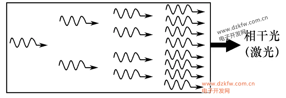 受激輻射過程能夠實現相同狀態(頻率、相位、振動方向及傳播方向均相同)的光子數目的幾何級數遞增,引起光放大。一個外來光子引發大量發光粒子產生受激輻射,并產生大量運動狀態完全相同的光子,這種現象稱為受激輻射光放大。