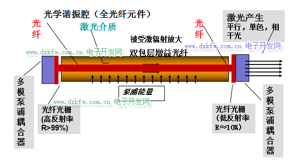 泵浦源:對激光工作物質進行激勵,將激活粒子從基態抽運到高能級,以實現粒子數反轉。可以是光激勵、氣體放電激勵、化學激勵、核能激勵等。激勵源的選擇取決于工作物質的特點。因而不同工作物質往往需要不同的泵浦源。如對固體激光器一般采用脈沖氙燈、碘鎢燈等光激勵的辦法,對氣體激光器則用電激勵方法,通過放電直接激勵工作物質。此外激勵源的選擇也應考慮到激勵效率等問題。