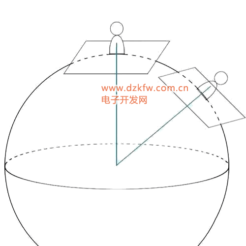 但實際上,地球是個球體,我們所認為的地平面或海平面,只是假想出來的一個平面,它與地球的大圓相切。我們站著的這個平面上與它垂直,并一直指向地球的球心。