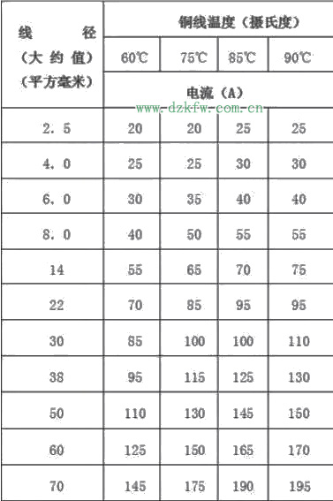 下面是銅線在不同溫度下的線徑所能承受的最大電流表格。