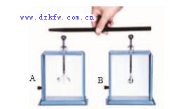 取兩個相同的驗電器A和B,使A帶電,B不帶電。可以看到A的金屬箔張開,B的金屬箔閉合。如圖,