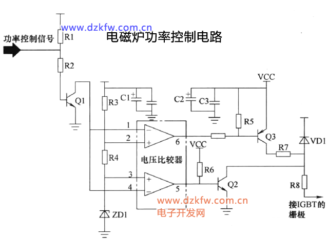 電磁爐功率控制電路的作用是控制IGBT的開與關,以控制電磁爐的發熱功率。功率模塊的內部電路主要由電壓比較器、外圍電阻、外圍電容、鉗位二極管、穩壓二極管和外圍驅動晶體管等組成。其工作原理如下: