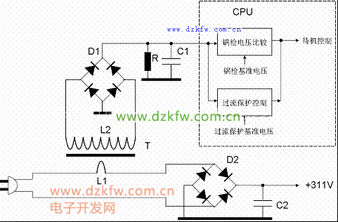 在一般的采用有電流互感器電流檢測的電磁爐電路中;這個經過D1及C1整流濾波后的電壓在有些電磁爐中也作為電磁爐的過流保護控制之用,當某些原因電磁爐發生異常過流現象時,L2的電壓就會較大幅度的上升(大大于電磁爐正常工作時的電壓),CPU內部的過流保護控制電路檢測到這個上升的電壓;即會判斷電磁爐有故障;從而發出信號關閉電磁爐的工作。