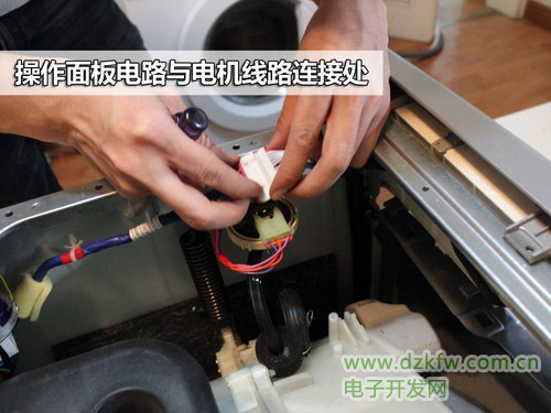 三星洗衣機的控制面板封裝在這個白色的盒子里,通過線路連接電源與電機。
