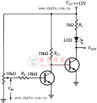 簡(jiǎn)單三極管開(kāi)關(guān):電路如圖5,電阻RC是LED限流用電阻,以防止電壓過(guò)高燒壞LED(發(fā)光二極管),將輸入信號(hào) VIN 從0 調(diào)到最大 (等分為約20 個(gè)間隔),觀察并記錄對(duì)的 VOUT 以及LED 的亮度。當(dāng)三極管開(kāi)關(guān)為斷路時(shí),VOUT =VCC =12 V,LED 不亮。當(dāng)三極管開(kāi)關(guān)通路時(shí),VOUT = 0.2V ,LED 會(huì)亮。改良三極管開(kāi)關(guān):因?yàn)槿龢O管由截止區(qū)過(guò)度到飽和區(qū)需經(jīng)過(guò)線性區(qū),開(kāi)關(guān)的效果不會(huì)有明確的界線。為使三極管開(kāi)關(guān)的效果明確,可串接兩三極管,電路如圖六。同樣將輸入信號(hào) VIN 從0 調(diào)到最大 (等分為約20 個(gè)間隔),觀察并記錄對(duì)應(yīng)的VOUT 以及LED 的亮度。