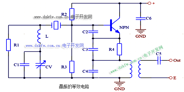 晶振五次泛音頻率一般在80~150MHz范圍,頻率更高,工作于五次泛音的電路常使用共基極的晶體管振蕩器: