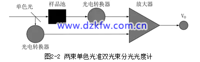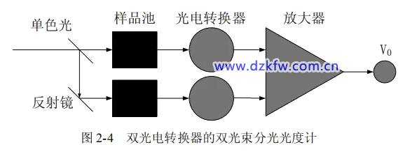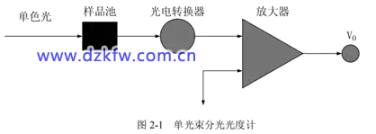 1) 單光束分光光度計(jì):只有一束單色光,一個(gè)樣品池,一個(gè)光電轉(zhuǎn)換器(通常采用硅光電池、光敏三極管或光電管),如圖2-1所示,其結(jié)構(gòu)簡單、價(jià)格便宜,但因其雜散光、光源波動、電子學(xué)的噪聲等都不能消除,故單光束分光光度計(jì)的光度準(zhǔn)確較差。