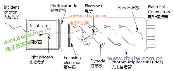 PMT是一種對紫外光、可見光和近紅外光極其敏感的特殊電子管,它能將微弱光信號通過光電效應(yīng)轉(zhuǎn)變成電信號輸出,使光信號能夠被測量。每個(gè)倍增電極上的電壓都高過它前面一個(gè)電極,使得電子能夠逐級加速。入射光子撞擊光電陰極產(chǎn)生光電效應(yīng),激發(fā)出的光電子被聚焦到倍增系統(tǒng),經(jīng)過一連串的二次發(fā)射使得電子倍增,最后到達(dá)陽極作為信號輸出。具有高靈敏度和低噪聲的優(yōu)點(diǎn)